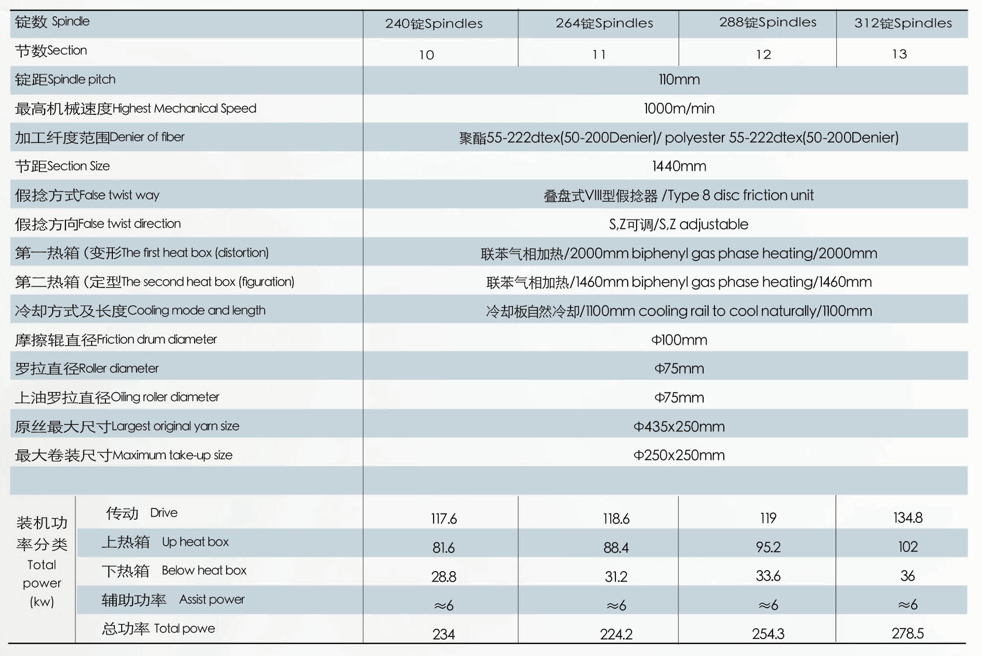 【設(shè)備用途Equipment use】 該機(jī)主要是將POY原絲(聚酯預(yù)取向絲),通過(guò)拉伸和假捻變形加工成具有低彈性能的假捻變形絲(DTY滌綸彈力絲),加工時(shí)在每個(gè)錠位將S捻和Z捻的雙絲合股直接一步加工...
